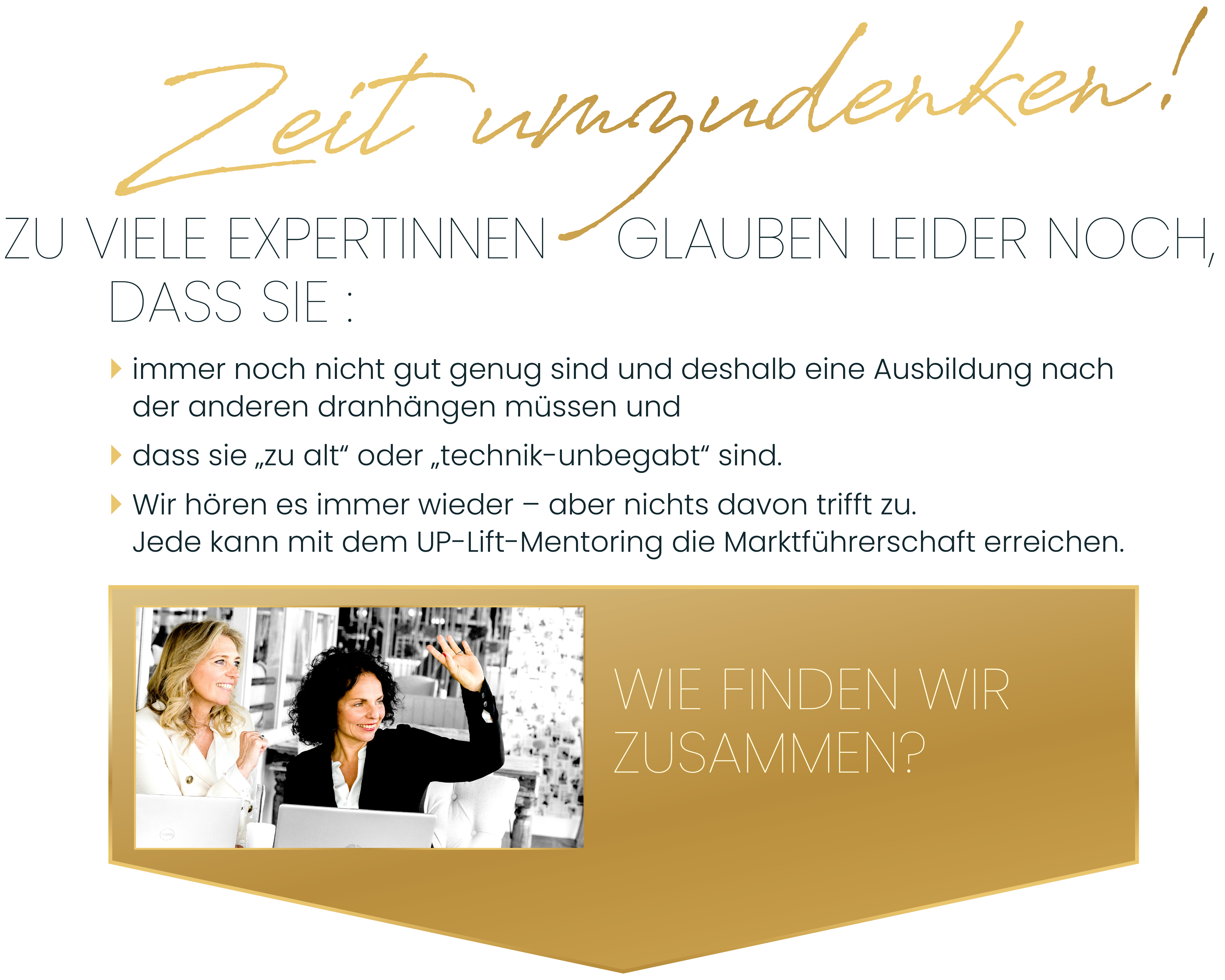Wir zeigen Dir mit Hilfe von unserem Erfolgsprozess „UP-Lift your Mind®“, wie Du Dein Denken sprengst, um überhaupt Deine Wunsch-Ergebnisse erreichen zu KÖNNEN. Limitations crashen, clever Chancen anziehen, den Glauben an Deine Unternehmerinnen-Power gezielt stärken!